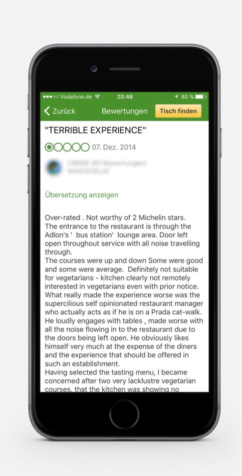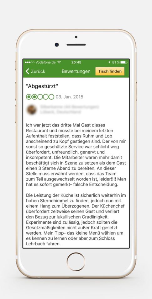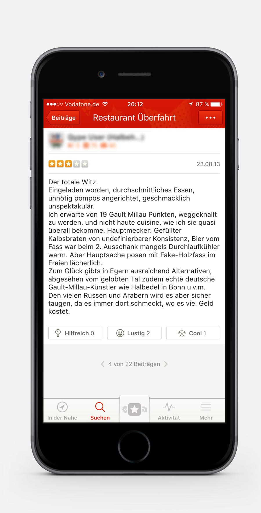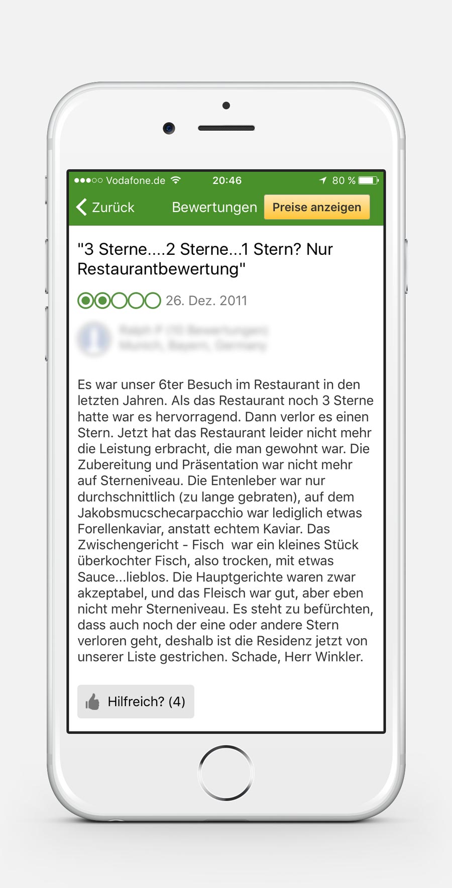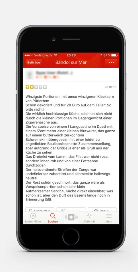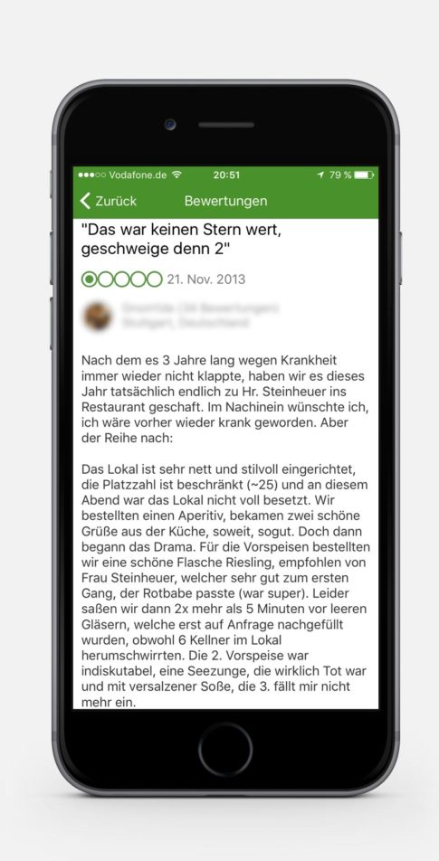 Ich spreche von „yelp“, „foursquare“, „tripadvisor“ oder andere Onlineplattformen. Sie machen es dem Nutzer möglich, Kommentare und vor allen Dingen Sternchen zu verteilen. Hier ist wie bei dem oben erwähnten Award längst nicht ersichtlich, wer hier alles abstimmt und inwiefern überhaupt die bewertete Lokalität besucht und als Gast erlebt worden ist. Eine örtliche Präsenz durch ein Vorbeilaufen am Wirtshaus reicht meist schon aus, um eine Bewertung abzugeben. Teilweise ist noch nicht einmal das notwendig. Nach welchen objektiven Maßstäben ein solches Urteil über die Leistung des Restaurants getroffen wird, kann nicht nachvollzogen werden.