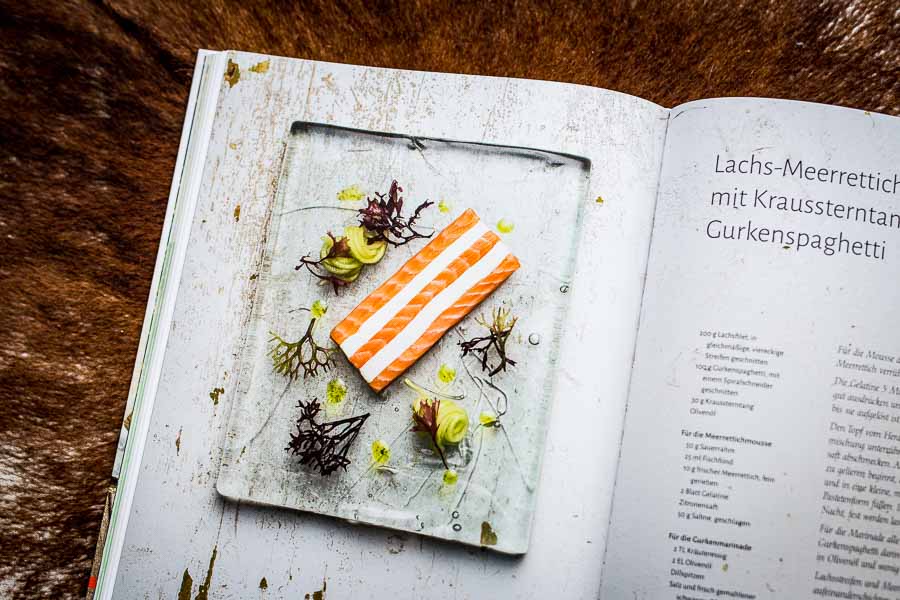 Insgesamt war die Anmutung des Buches bisher recht angenehm bis bescheiden, was auch damit zu tun hat, dass zum Beispiel die bis hier aufgeführten Rezeptfotos eher sehr klein (ca. 10cm x 7cm) dargestellt worden sind. Ich hatte schon die Befürchtung, dass sich das Konzept durch das ganze Buch ziehen würde. Doch sah man es wohl offensichtlich vor, die eigene kreative Küche von der klassischen abzugrenzen, um diese dann großformatig und angemessen präsentieren zu können. Die großflächige Darstellung auf einer ganzen Seite steht den Gerichten nämlich sehr gut. So wirkt ein recht klassischer Geschmacksakkord von Lachs und Meerrettich mit Gurke in der hier gezeigten Version sehr modern und bereitet zudem Lust auf das Nachmachen.