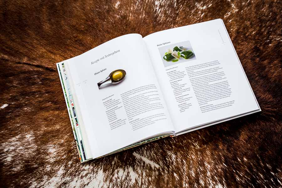 So umfassen die ersten Rezepte vor allen Dingen die Zubereitung von Texturgeber um zum Beispiel Dinge wie Oliven-Spähren, Pesto-Spähren, einen Algenmikrobiskuit oder einen Algen-Reis-Chip herstellen zu können.