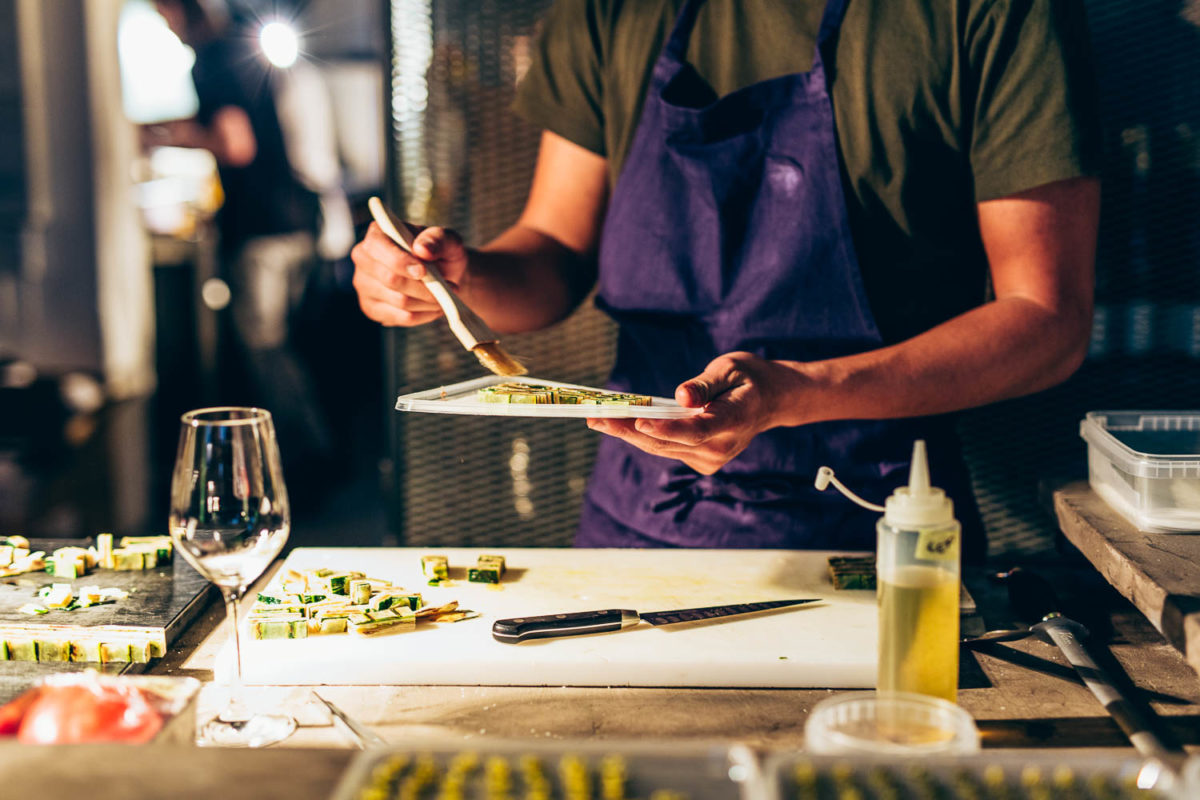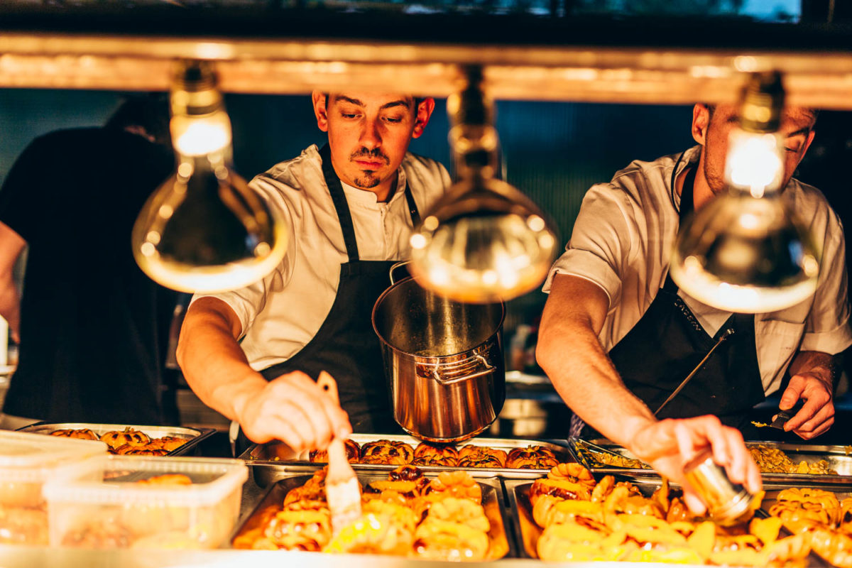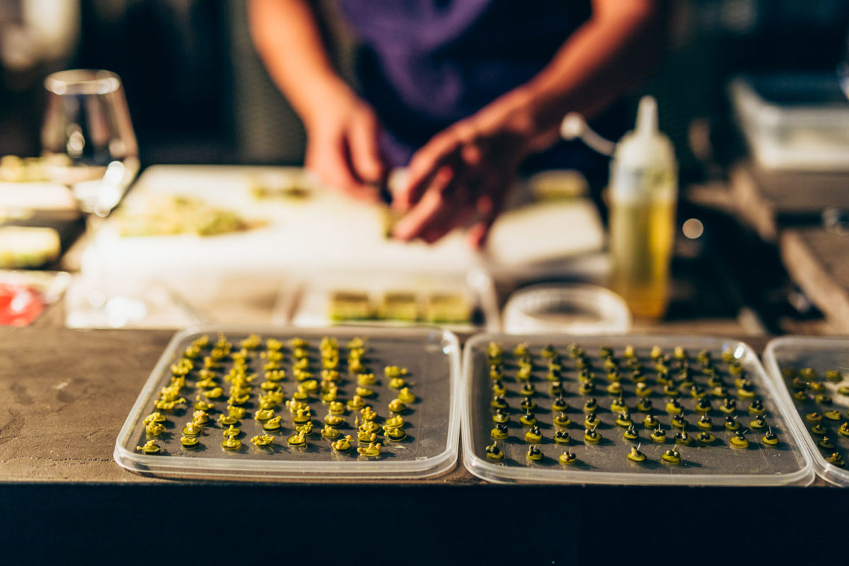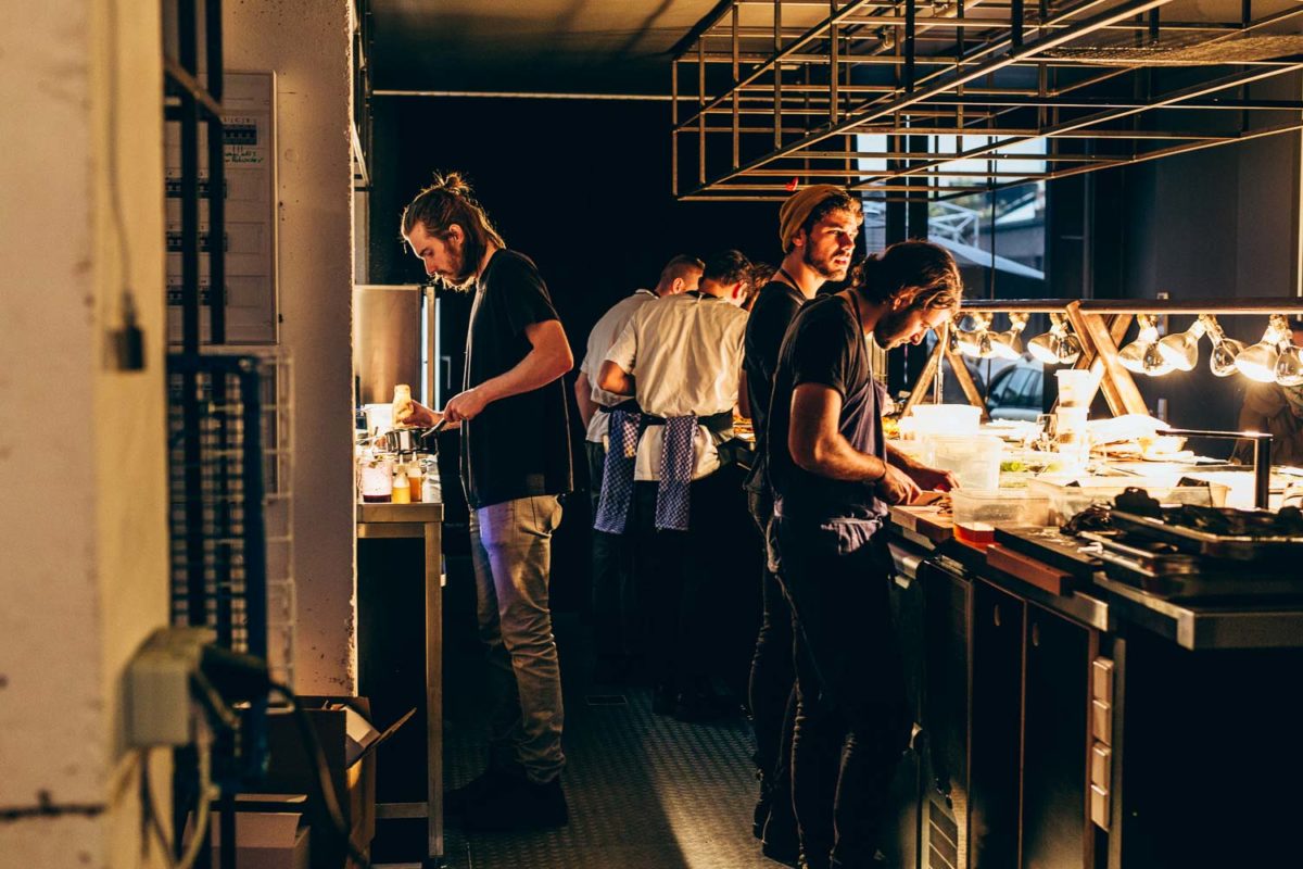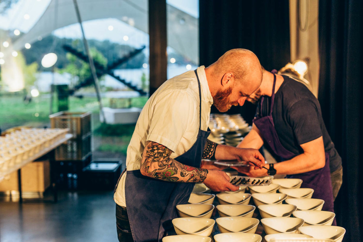 Heute macht uns das Wetter einen kleinen Strich durch die Rechnung. Der Sonnenuntergang muss heute leider ausfallen. Davon lässt sich hier im Team aber keiner unterkriegen. Zu wummernden Bässen wird nämlich nebenan von einem guten Dutzend Köchen das Essen vorbereitet. Die Jungs aus dem Kadeau und dem Ernst sind bereits im vollen Gänge, als ich angekommen bin.