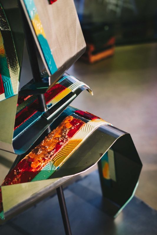 Beim Betreten der Räumlichkeiten im Studio C ist ihre Skulptur der Eyecatcher schlechthin. Die verschiedenen Ebenen grenzen sich durch ihre teils abtragbaren, farbigen Oberflächen voneinander ab und fallen darüber hinaus durch ihre geometrische Anordnung ins Auge. Diesem Menü, welches bis zum letzten Gericht von Nicolai im Sitzen eingenommen wird, folgt nun ein sehr interaktiver Teil, welcher mit einer kleinen Instruktion durch die Künstlerin selbst eingeleitet wird.