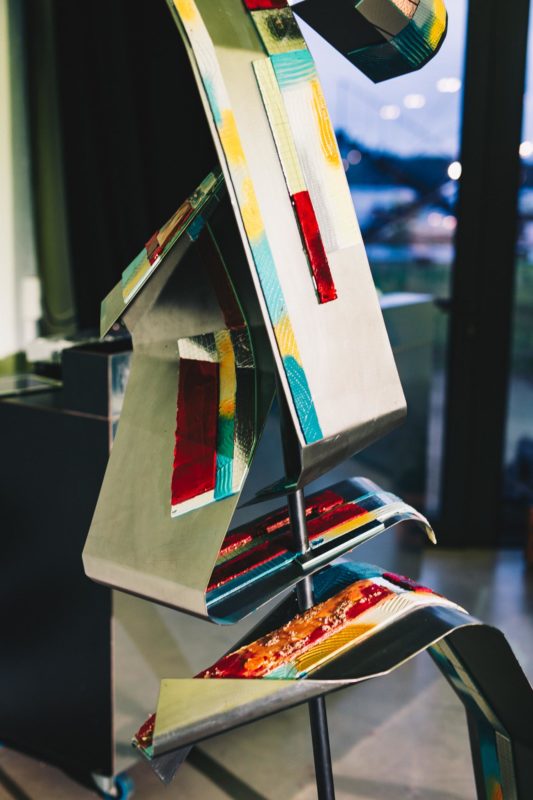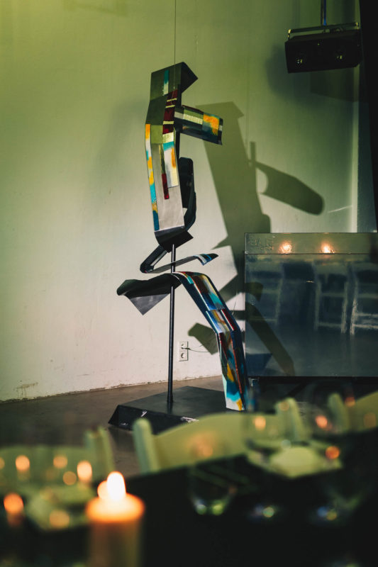 Beim Durchlaufen der Eventfläche bemerke ich recht schnell die sehr auffällige Skulptur, um die sich heute ebenso alles drehen wird. Sie ist bunt und mit verschiedenen, geschwungenen Flächen aus Metall ausgestattet. Schaut man aus den sehr großen Fenstern, hat man einen fantastischen Blick auf das anliegende Gewässer. Die Parties im Sommer müssen einfach legendär sein.