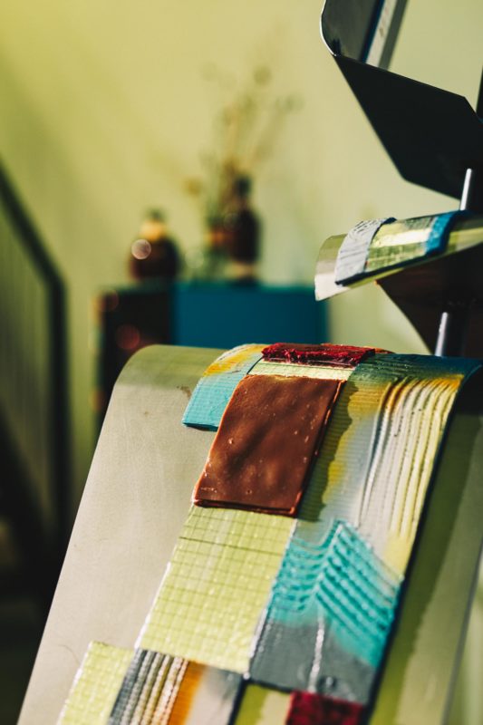 Im Laufe des Tages hat Kristiane Kegelmann die einzelnen geometrischen Flächen mit Schokolade und Cremes verkleidet. Hierbei spielt sie mit Honigschokolade, geräuchertem Heu sowie geröstetem Buchweizen. Rote Bete und Beeren bringen neben der Farbe noch erdig-süßen Geschmack hinzu.