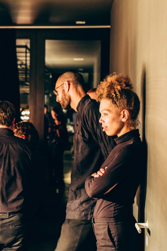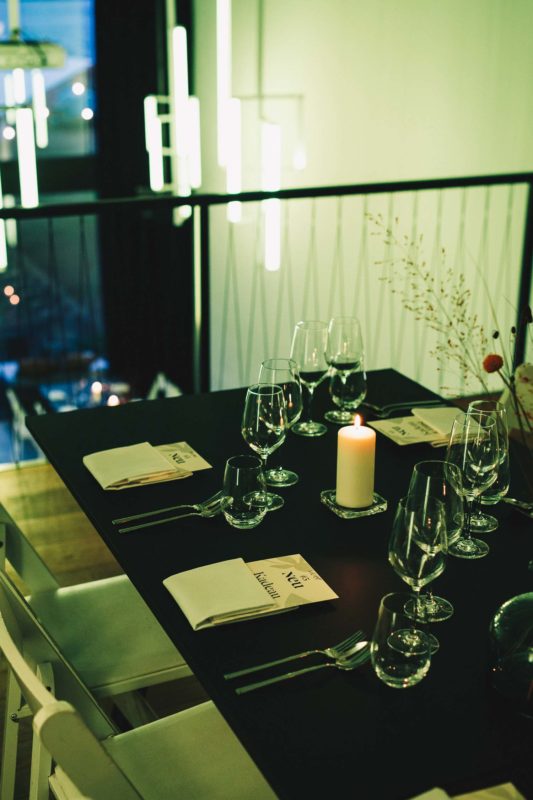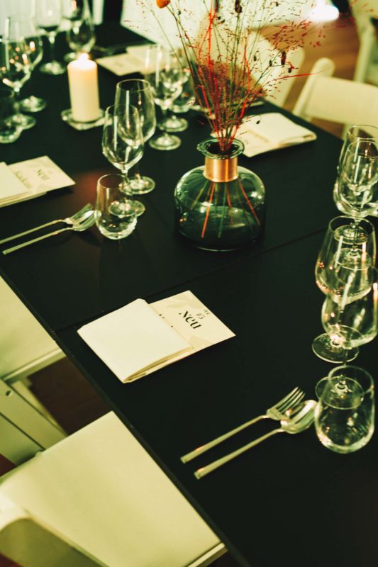 Treffpunkt für dieses NEU DINNER #3 war das Studio C. Es befindet sich inmitten einer Industrielandschaft im Südosten Berlins. Dieser industrielle Look ist ebenso in der Location wiederzufinden, jedoch auf eine sehr gemütliche Art. Der schmale, lange und recht hohe Raum ist eingerahmt von glatt verspachtelten weißen Wänden.
