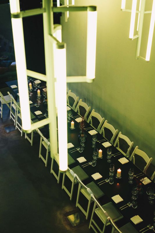 Hier wurde eine lange Tafel mit ungefähr 50 Plätzen aufgebaut. Kerzen sorgen für eine warme Stimmung, während ein grünes Neonlicht die Atmosphäre in eine sehr individuelle Stimmung lenkt. Eine schwarze Treppe führt zu der Fläche im ersten Geschoss, welches Platz für zwei weitere Tafeln und 25 Gäste bereithält. Der Service findet später also auf zwei Ebenen statt.