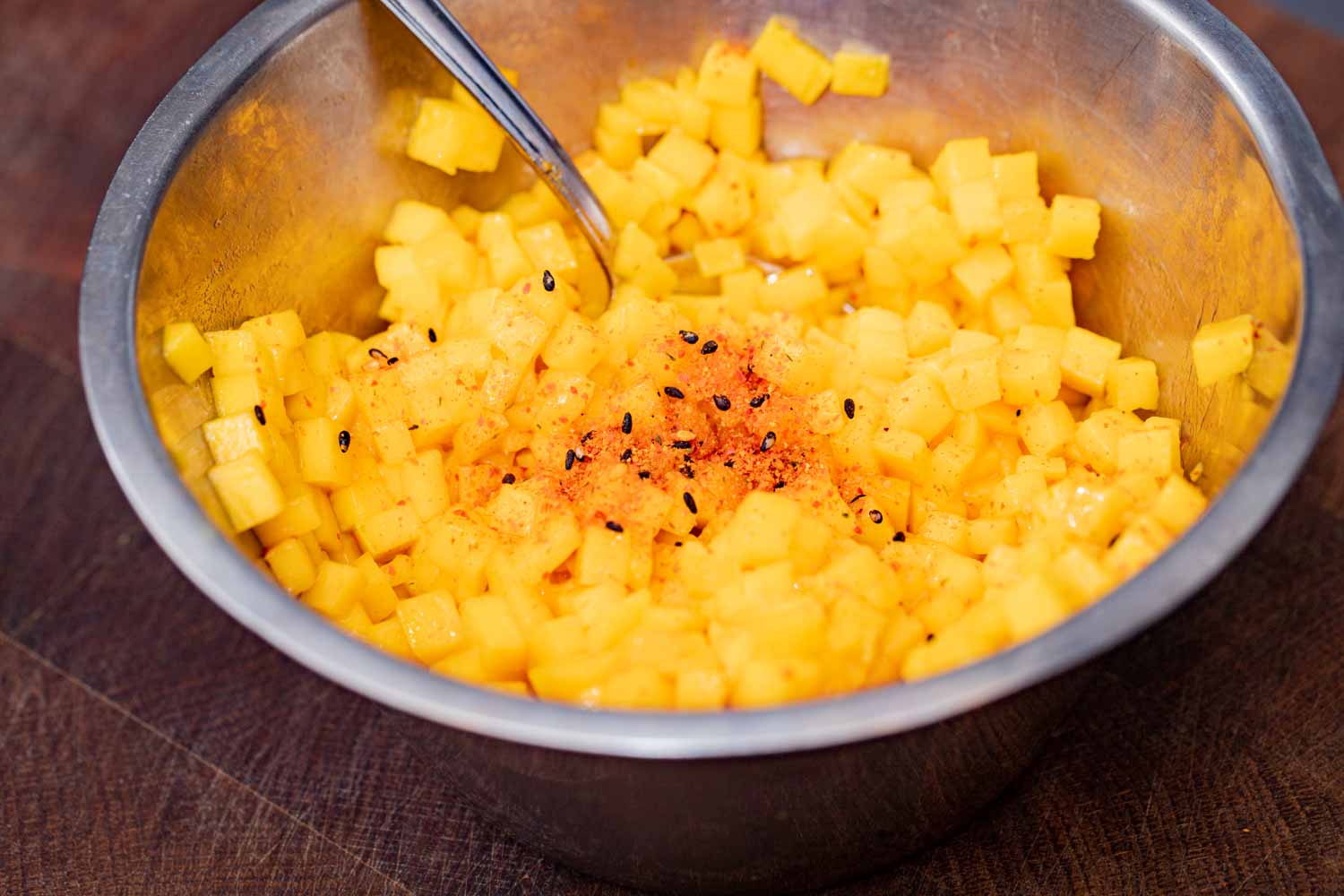 - Mangochnutey mit Chili und Sesamöl • Die Mango schälen und das Fleisch längs am Kern vorbei herunterschneiden. Die Hälften in 5 mm Scheiben und danach 5 mm Würfel daraus schneiden. Die Würfel in eine Schale geben und zusammen mit dem Chili-Pfeffer abschmecken.