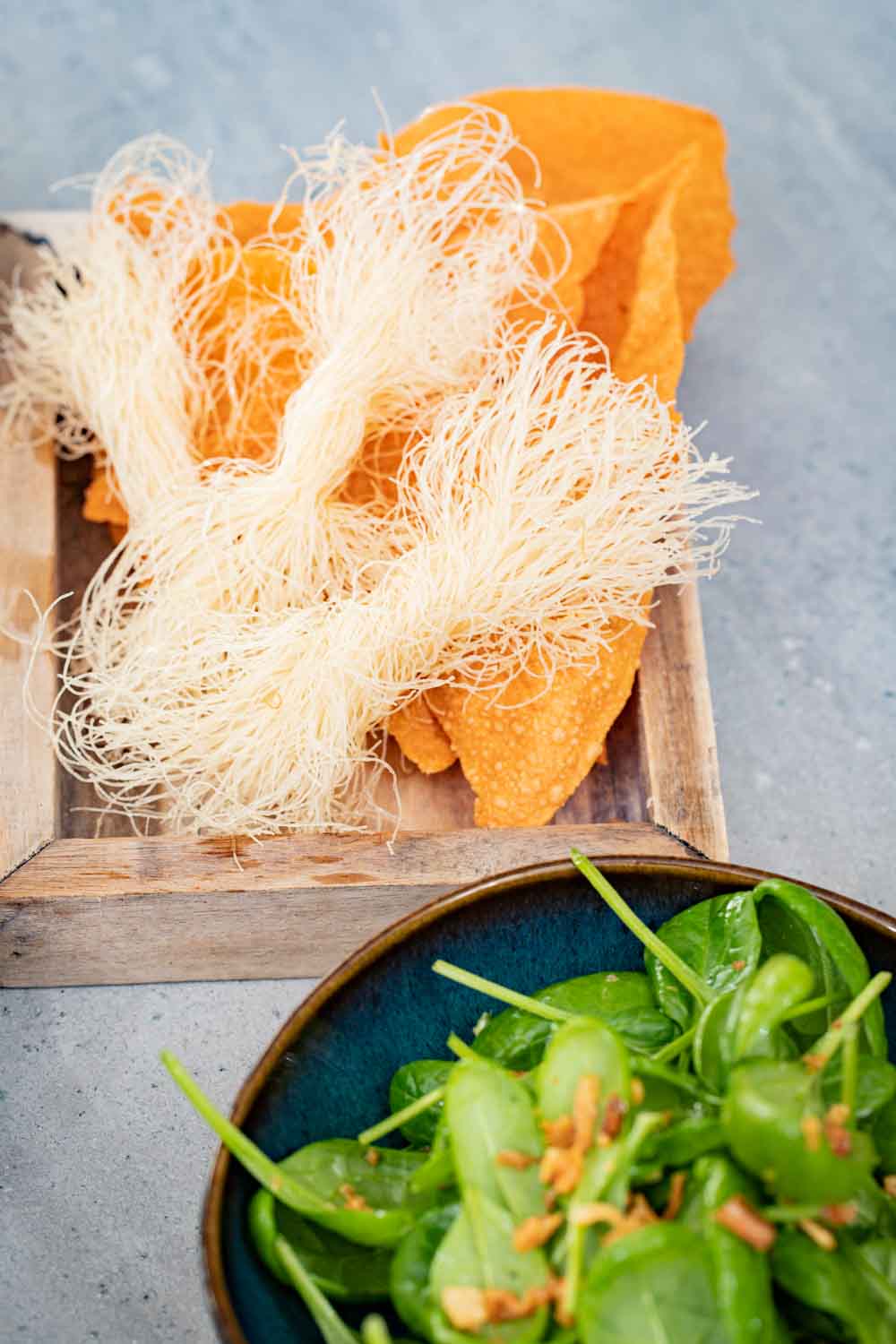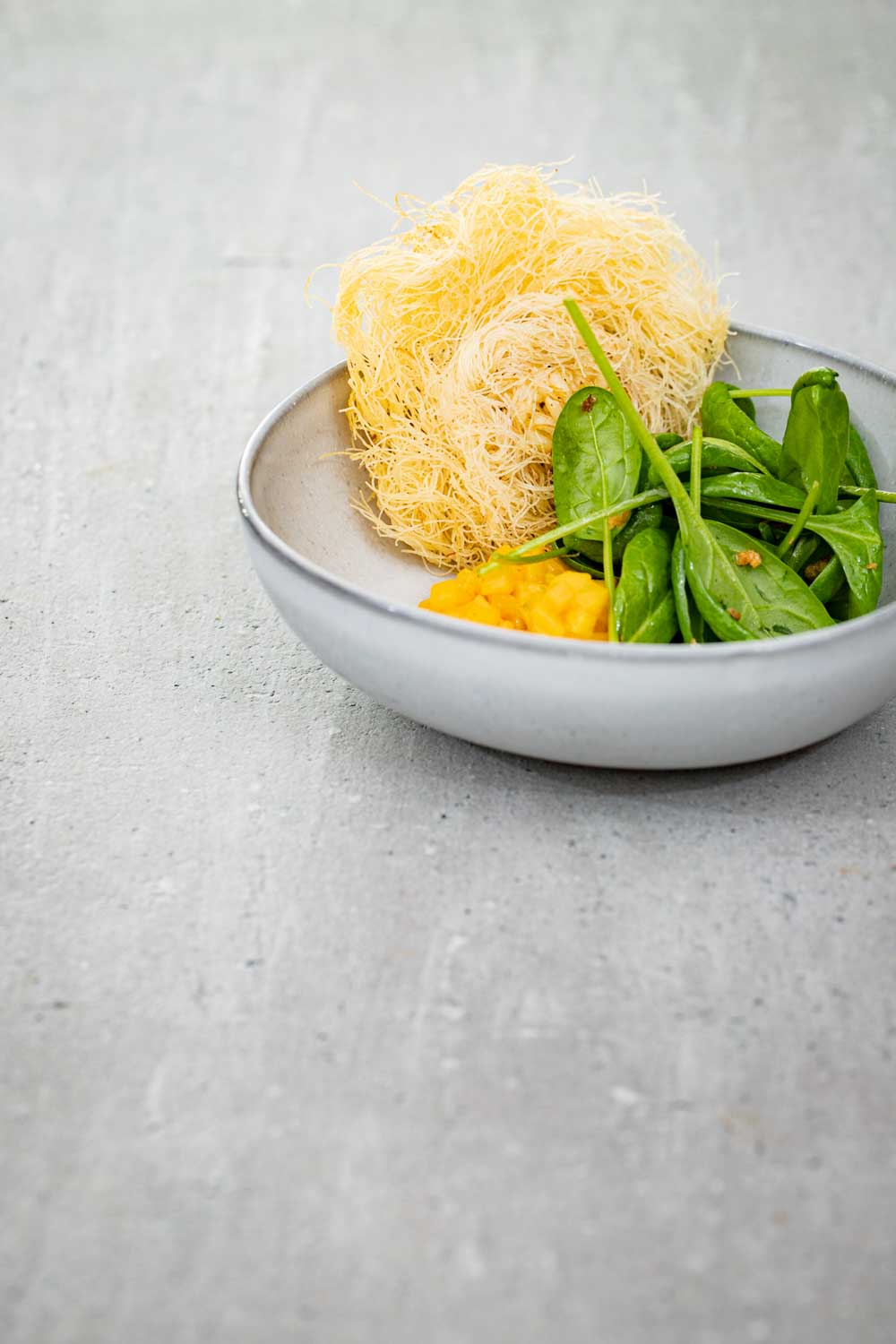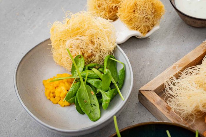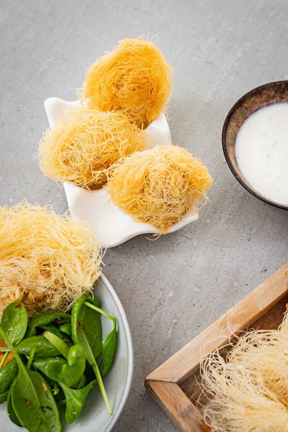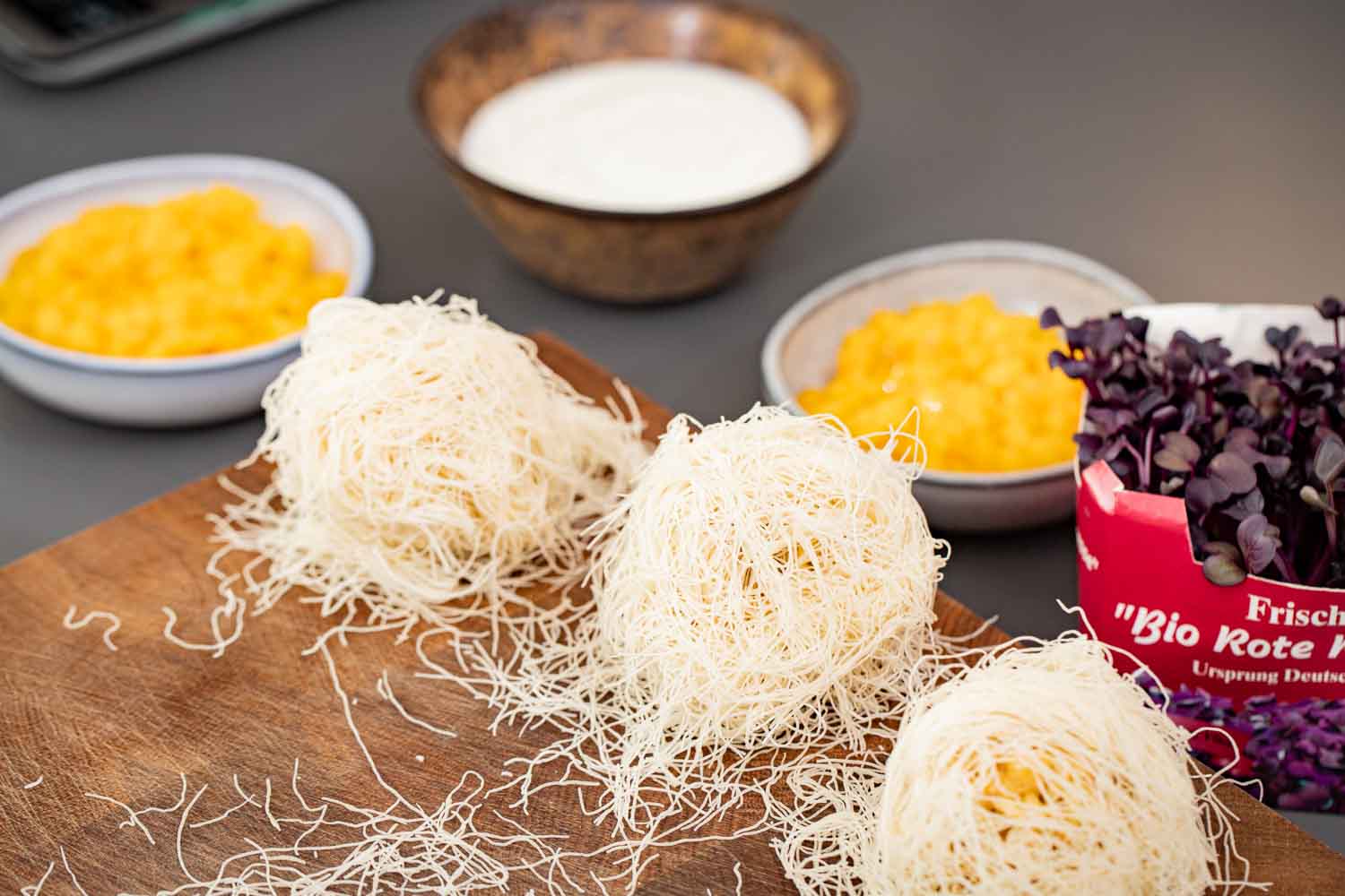 Für meine vegane Kreation wollte ich noch ein wenig mehr wagen, als lediglich die tierische Komponente wegzulassen. Denn genau die knusprige Hülle besteht in der ursprünglichen Form aus einer klassischen Panierung, die Du vermutlich schon von dem Wiener Schnitzel her kennen wirst. Und die besteht nun mal aus Ei. Als ich zuletzt im Feinkostladen eine Packung des Kadaifi erblickte, kam mir die Idee, diesen als Knuspermantel für die Arancini herzunehmen. Denn hier ist kein Ei notwendig, damit die Hülle haften bleibt. Du kannst die Teigfäden sehr leicht einfach um die Bällchen herumwickeln.