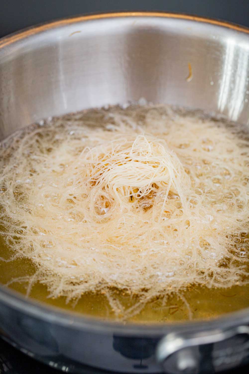 - Die Bällchen mit dem Kadaifiteig einhüllen und in 170°C heißen Pflanzenöl ausbacken bis sie goldgelb sind. Danach in den vorgeheizten Ofen geben und für 10 Minuten fertig backen, bis sie im Kern heiß sind.