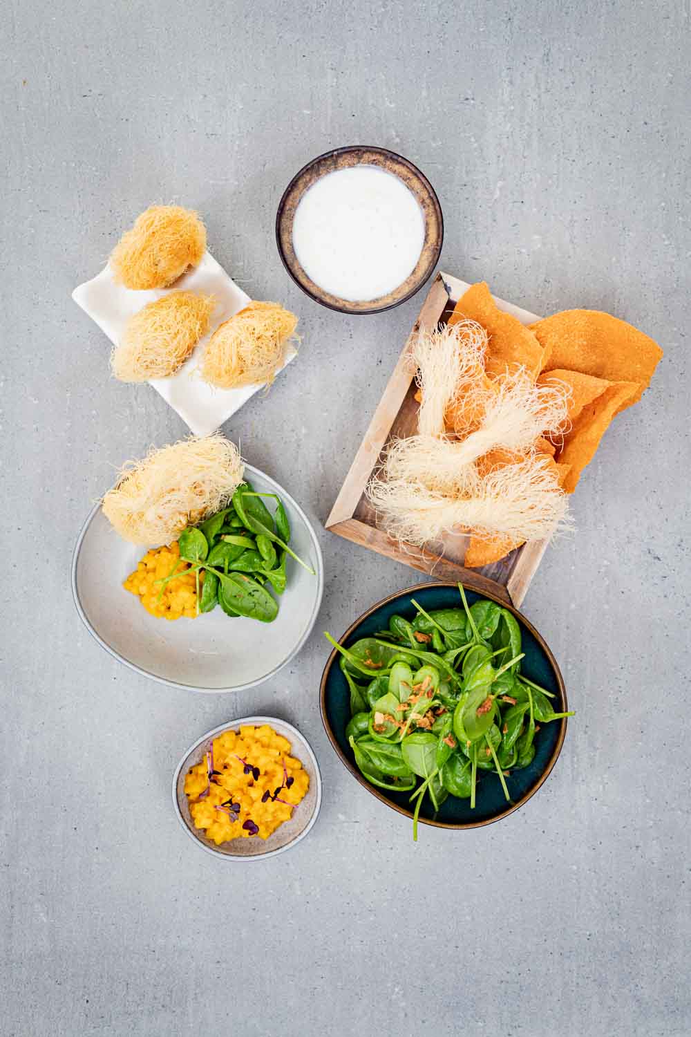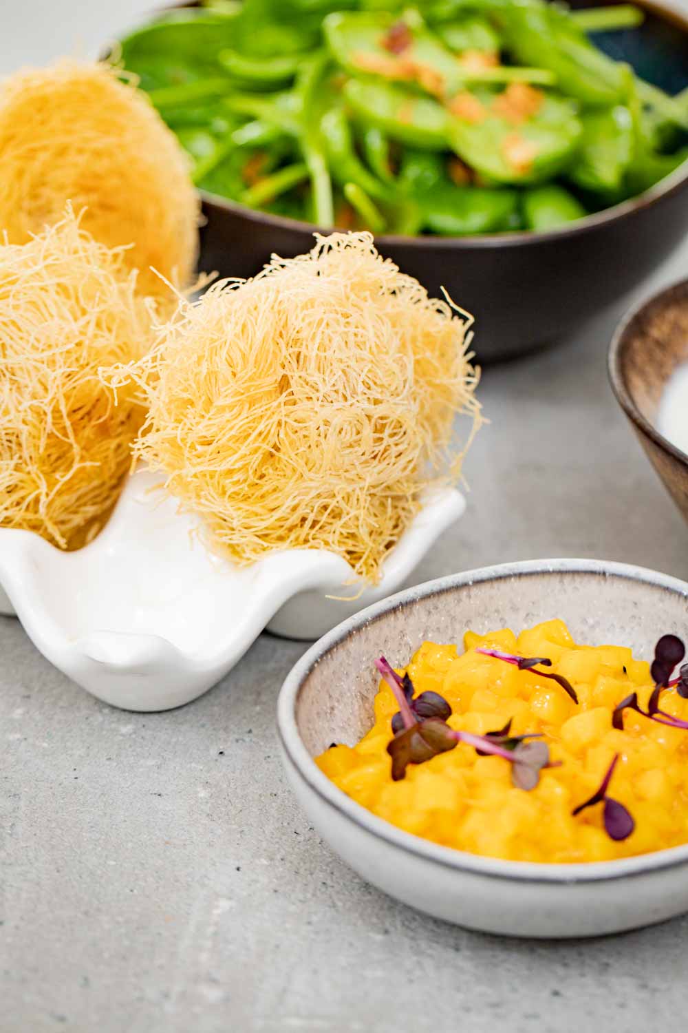 Arancini im Kadaifi-Knuspermantel mit Mangochutney und Limettenjoghurt