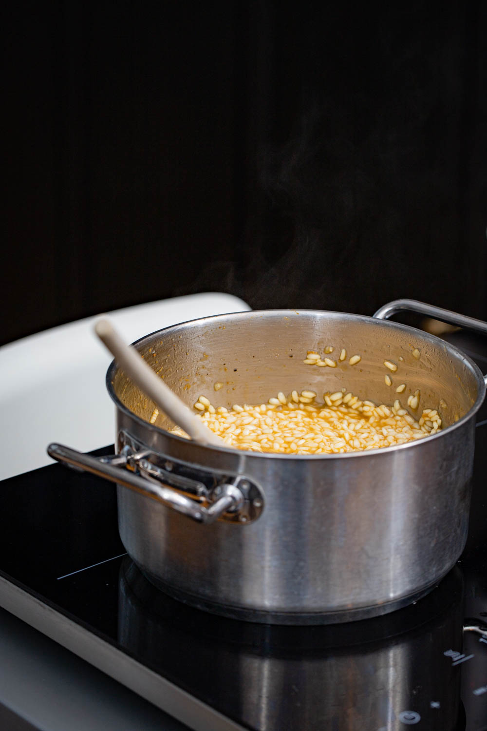 - Einen weiten Topf auf mittlerer Stufe erhitzen und das Olivenöl zugeben. Die Zwiebelwürfel hinzugeben und glasig anschwitzen. Den Risottoreis hinzugeben und mitschwitzen und mit dem Weißwein ablöschen. Das indische Curry-Gewürz zugeben und unter Rühren auflösen. Den Weißwein reduzieren und die angestoßene Knoblauchzehe zugeben.
