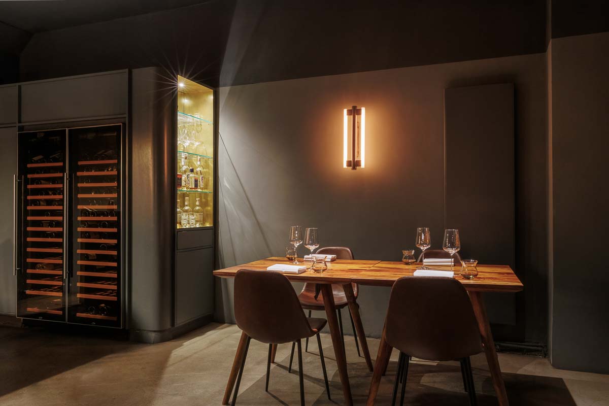 Dunkle Holztöne, eine durchgehende samtige Sitzbank in leuchtendem Gelb, ein imposanter Weinkühlschrank – das ist mehr Galerie als klassisches Fine-Dining-Restaurant. Es fühlt sich fast ein bisschen an wie ein Wohnzimmer, nur eben eines, das von Menschen eingerichtet wurde, die sehr genau wissen, was sie tun. Der Empfang ist herzlich, der Service aufmerksam, aber nicht überkandidelt. Alles wirkt konzentriert – aufs Produkt, aufs Erlebnis, auf den Moment.