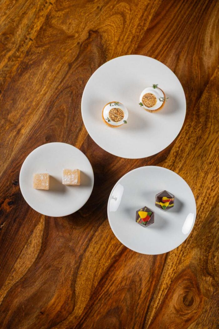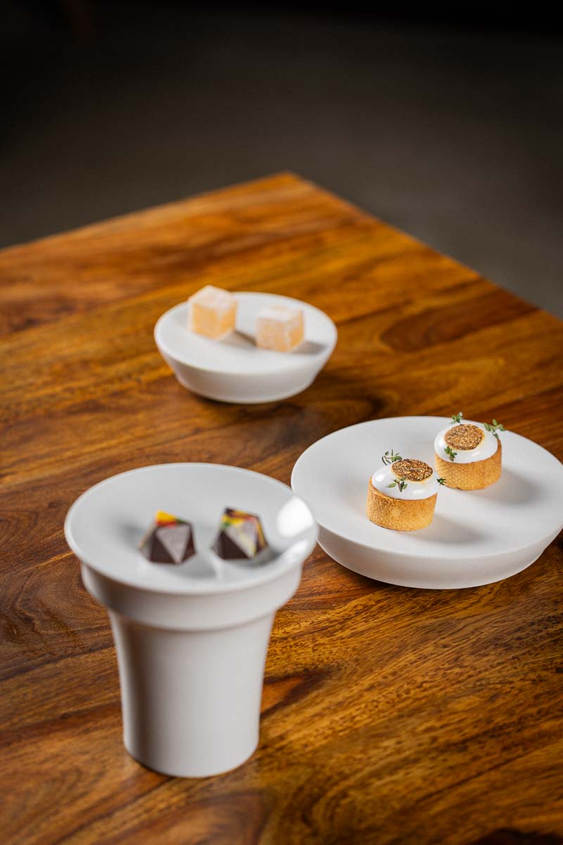Zum Schluss wird es im PRISM noch einmal bunt, verspielt und ein bisschen nostalgisch. Die Präsentation der Petit Fours gleicht einer kleinen Parade – kunstvoll angerichtet, jedes Element auf seiner eigenen Porzellanbühne.