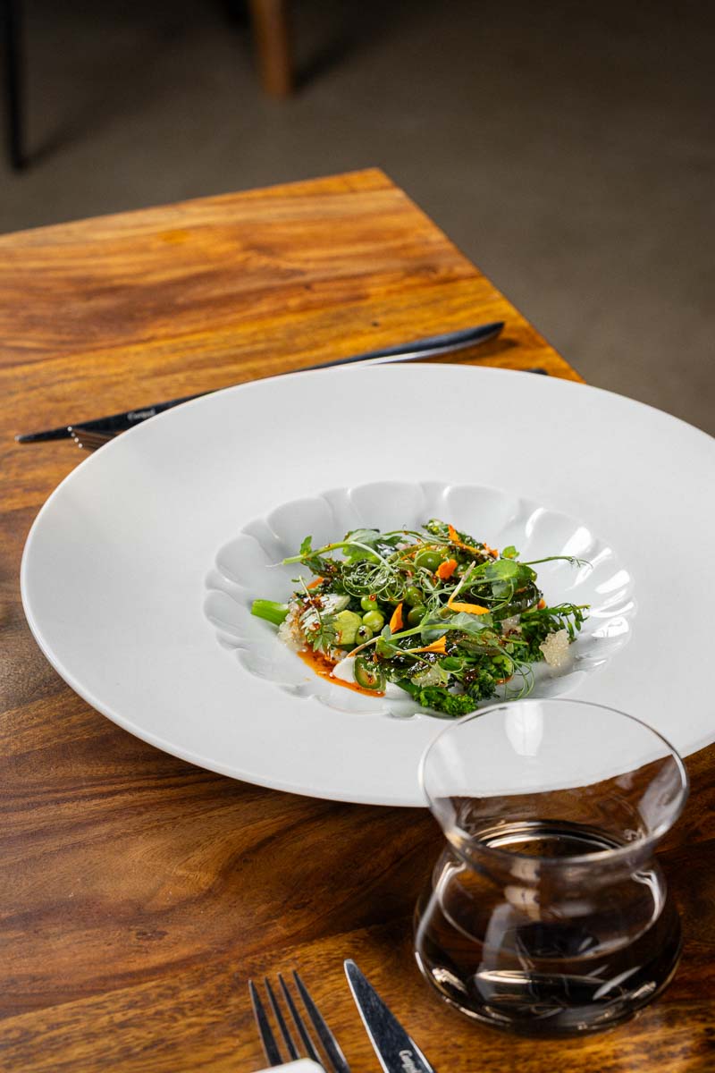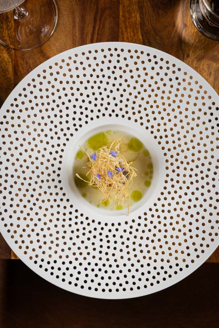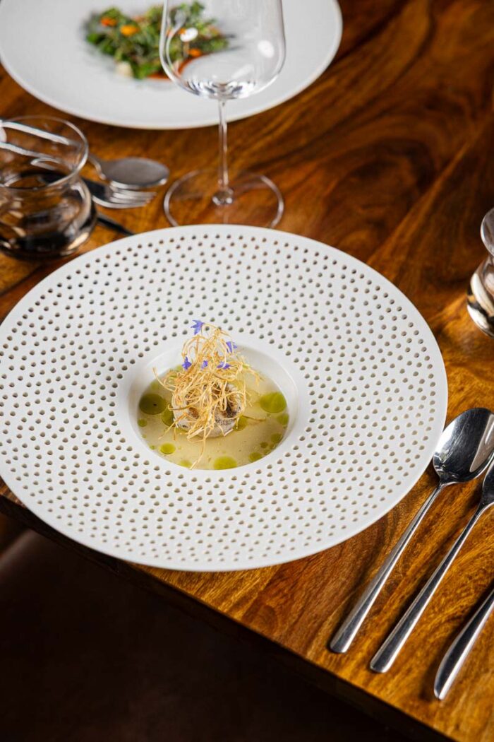 Ein Gang wie ein Frühlingsspaziergang in einem Gewürzgartenbildet den Start im PRISM: Der wild gewachsene Brokkoli – wahrscheinlich ein Verwandter des italienischen „Cime di Rapa“ – kommt knackig und intensiv grün auf den Teller, eingerahmt von grünen Erbsen, deren Süße eine perfekte Balance zum pikant-frischen Stracciatella bildet. Der Clou aber ist das Zusammenspiel mit Ma La – einer Gewürzmischung mit Szechuanpfeffer und Chili, die durch ihre prickelnde Schärfe fast schon elektrisierend wirkt. Dazu Kinome, das junge Blatt des japanischen Sansho-Baums, das mit zitronig-pfeffrigen Noten ein feinherbes Gegengewicht bietet. Finger Limes steuern eine frische Säure bei, während kleine Ringel von Tagetes den Gang optisch abrunden. Ein sehr präziser, aromatisch dichter Teller mit tollem Texturspiel und eleganter Wucht.