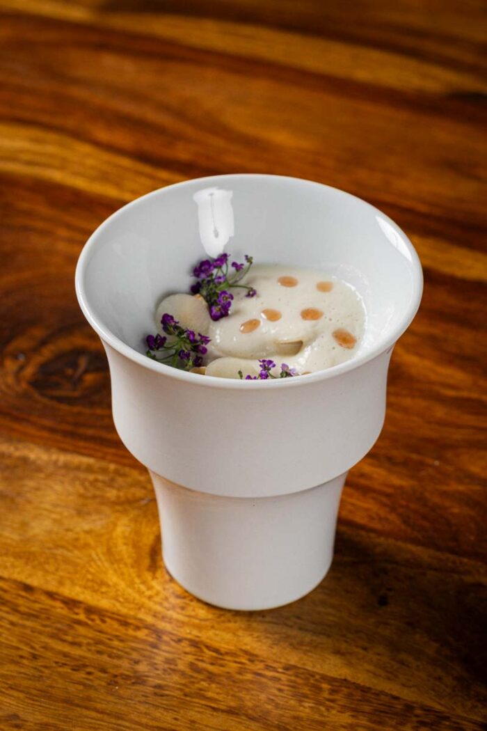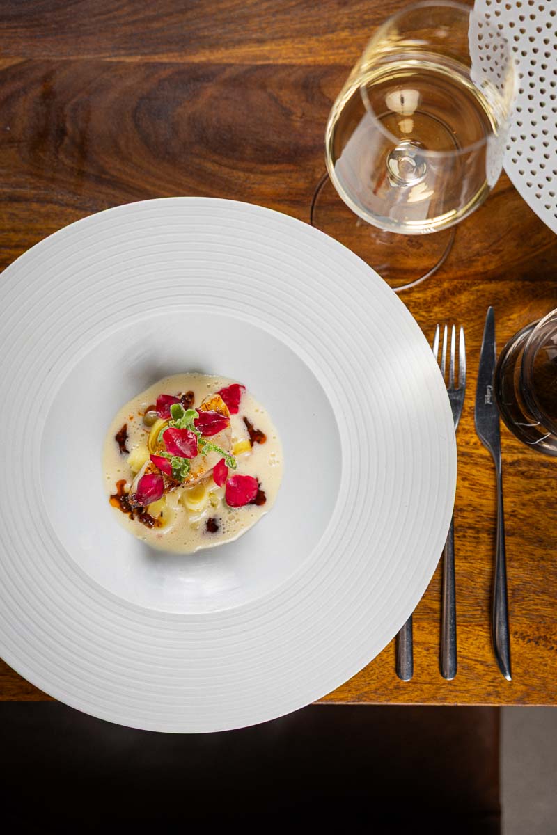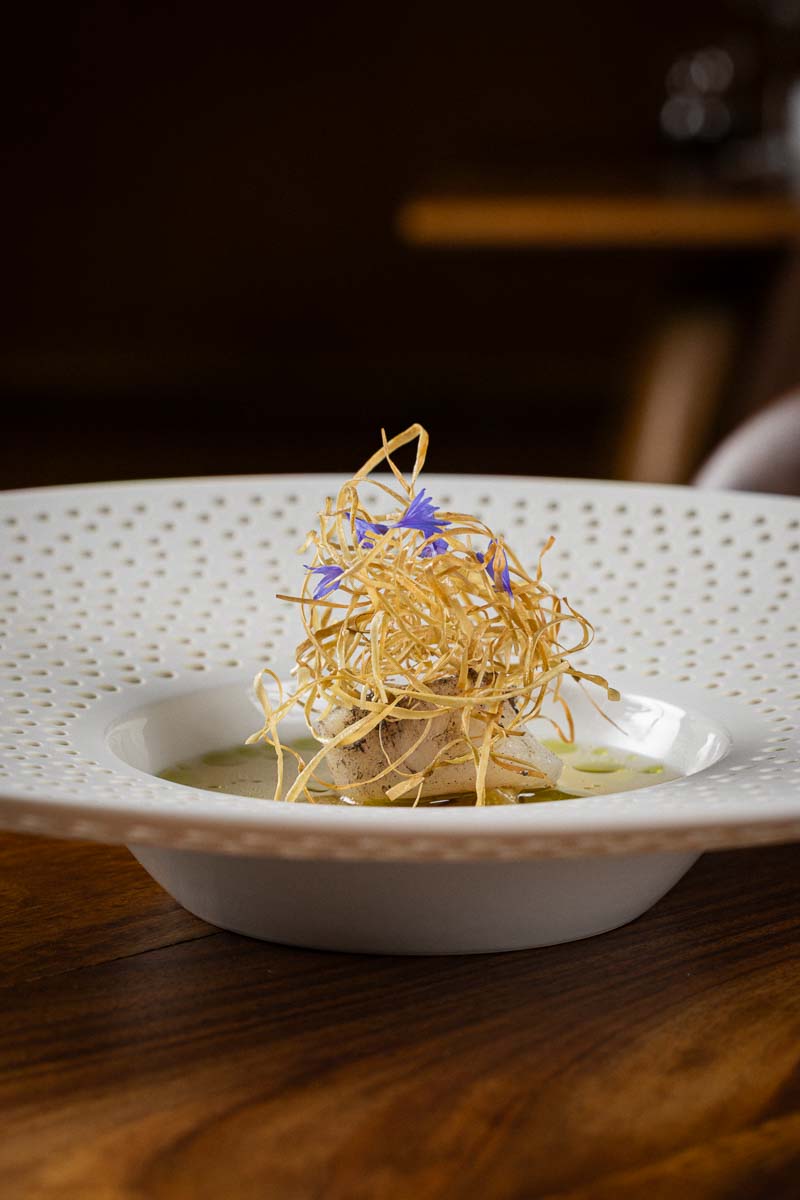 Danach wird’s knusprig: Eine kleine, filigrane Croustade, gefüllt mit einem wunderbar rauchigen Labneh, ergänzt durch gegrillten Spargel und Rosinen, die für eine süßliche, weiche Nuance sorgen. Der Boden ist krachend-knusprig, die Füllung cremig und frisch. Dekoriert mit Blüten, fast ein kleines Stillleben auf Porzellan. Und: sehr balanciert.