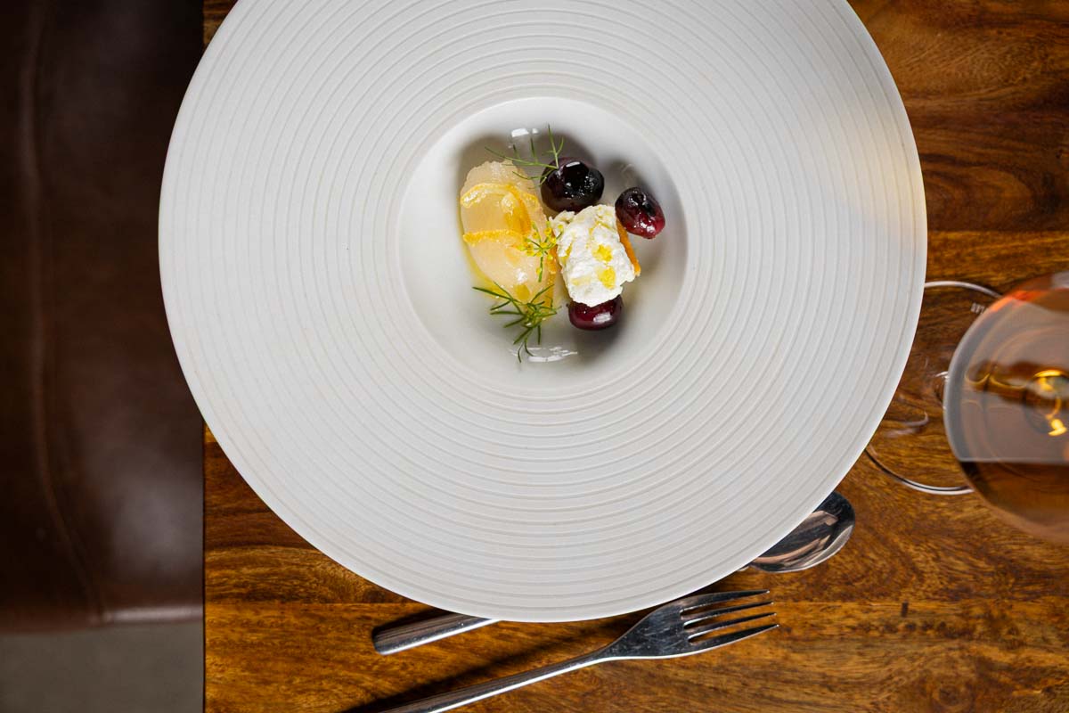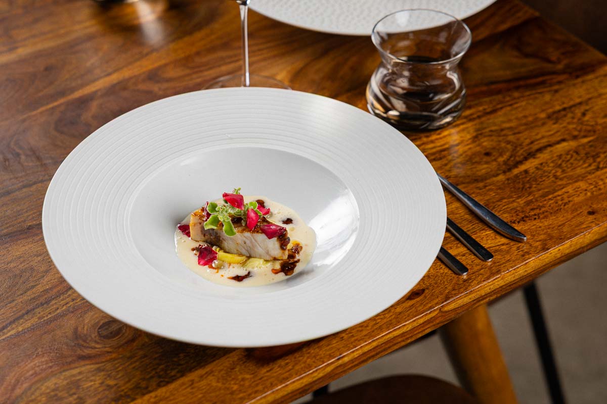Hier wird’s deutlich lauter – zumindest, was die Aromen angeht. Der Adlerfisch – perfekt gegart, mit zartem, fast schmelzendem Fleisch – liegt auf einem Bett aus geschmortem Lauchgemüse mit jungem Knoblauch. Letzterer bringt milde Tiefe, kein aufdringliches Knoblauchbombardement. Die Sauce? Eine Reduktion aus Verjus, die dem Ganzen eine säurefrische Leichtigkeit verleiht.