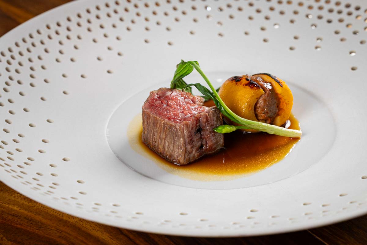 Einer der wohl eindrucksvollsten Gänge des Abends im PRISM: das butterzarte Kagoshima A5 Wagyu – perfekt gegart, mit exakt dem richtigen Maß an Bräunung und Saftigkeit. Daneben rollt ein Loquat-Kebab auf den Teller, der mit seinem süß-säuerlichen Profil und einer feinen Rauchnote überrascht.