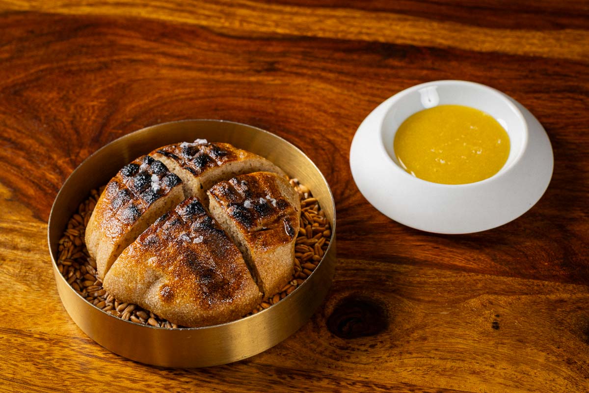 Los geht’s mit einem vermeintlich simplen Brotgang – wobei „simpel“ hier schon fast eine Beleidigung wäre. Das Feuerbrot aus Kamut, lauwarm serviert, hat eine intensive Röstnote, außen knusprig, innen soft – Textur 10/10. Dazu eine Olivenölmarmelade, die fast an Honig erinnert, mit einer leichten Süße und seidiger Konsistenz. Es ist ein Auftakt, der nicht laut ist, aber klarmacht: Hier wird mit Kontrasten gespielt. Rauch trifft Süße, Brot wird zur Botschaft.