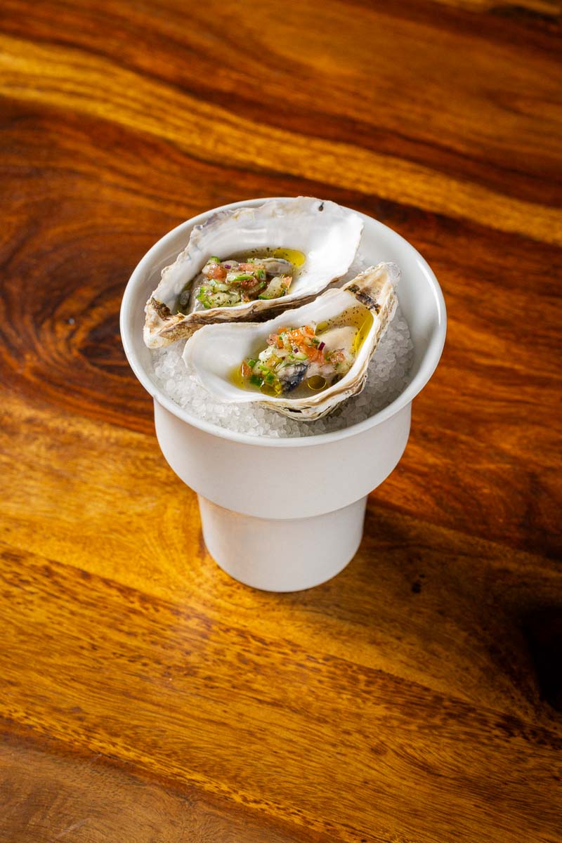 Die Auster, serviert auf Eis, kommt mit einem fein gehackten Gemüsesalat, der an eine levantinische Vinaigrette erinnert. Die Texturen sind spannend – knackig, kalt, salzig, mild. Das Zusammenspiel von Salinität, Säure und Frische funktioniert großartig. Kein Effekt um des Effekts willen, sondern einfach ein sehr präziser Moment am Gaumen. Es bleibt lange ruhig danach – im besten Sinne.