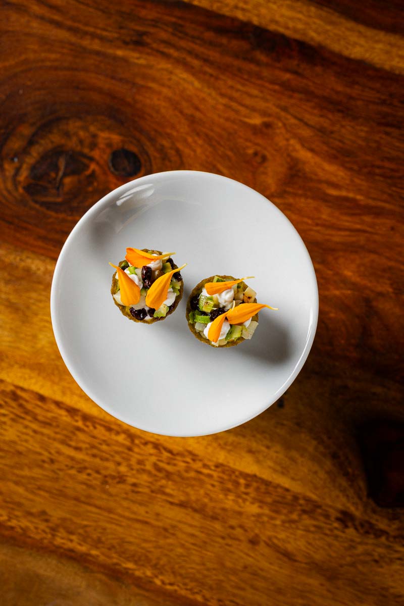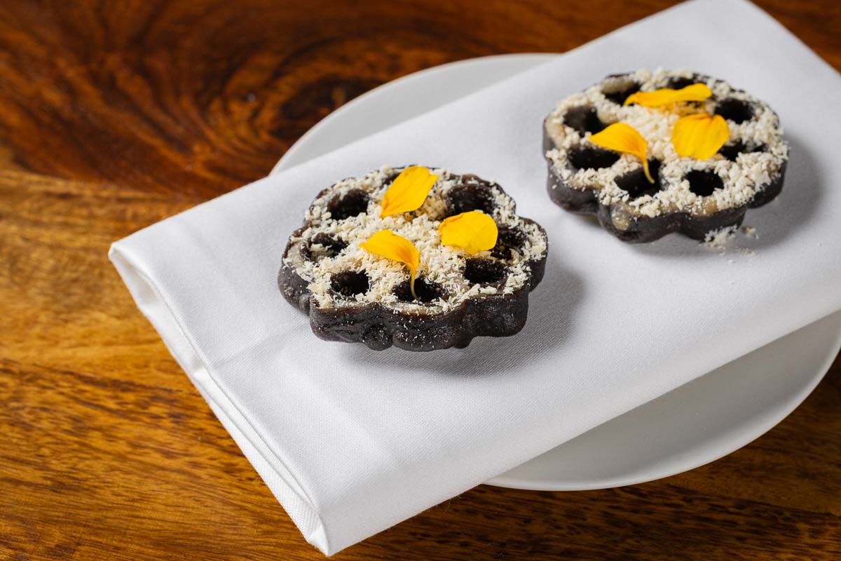Zum Abschluss der Snackreihe: ein Auberginenchip, schwarz, tief, kross, mit fermentiertem Joghurt, der eine gewisse Fülle, fast etwas animalisches Funkeln mitbringt. Auch hier wieder: knusprig trifft cremig, geröstet trifft fermentiert. Und weil es optisch wie kulinarisch clever gemacht ist, bleibt der kleine Chip erstaunlich lange im Kopf.