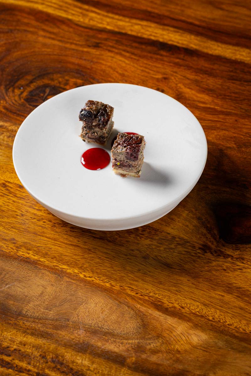 Der für mich stärkste Snack in dieser ersten Runde: Pâté en Croûte in perfekter Konsistenz – nicht zu kühl, nicht zu fest, innen saftig, außen mürbe. Dazu eine Sauerkirsch-Mostarda, die sich weder in Süße noch in Schärfe verliert, sondern genau diesen Punch mitbringt, den man bei so einer Kombination sucht. Ein Highlight.