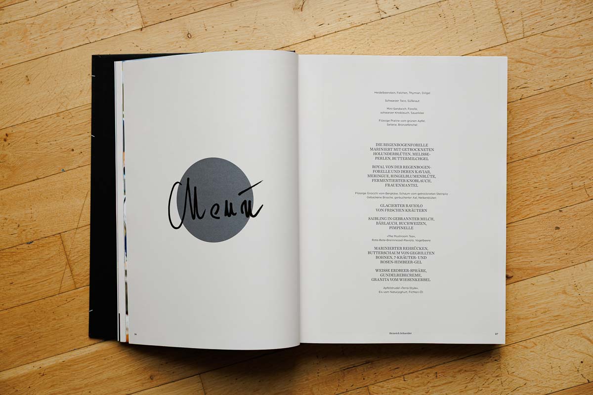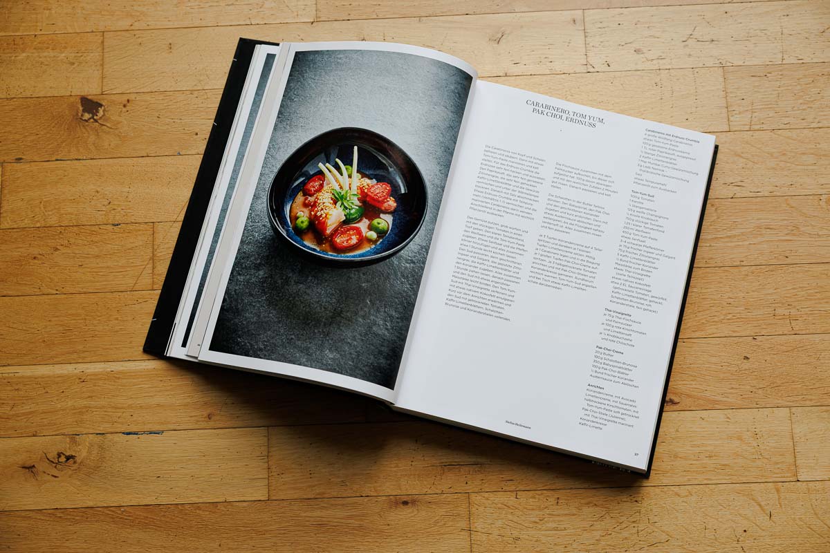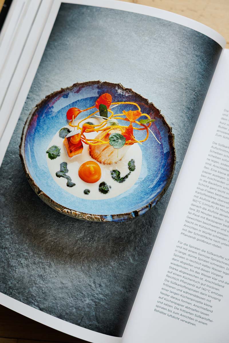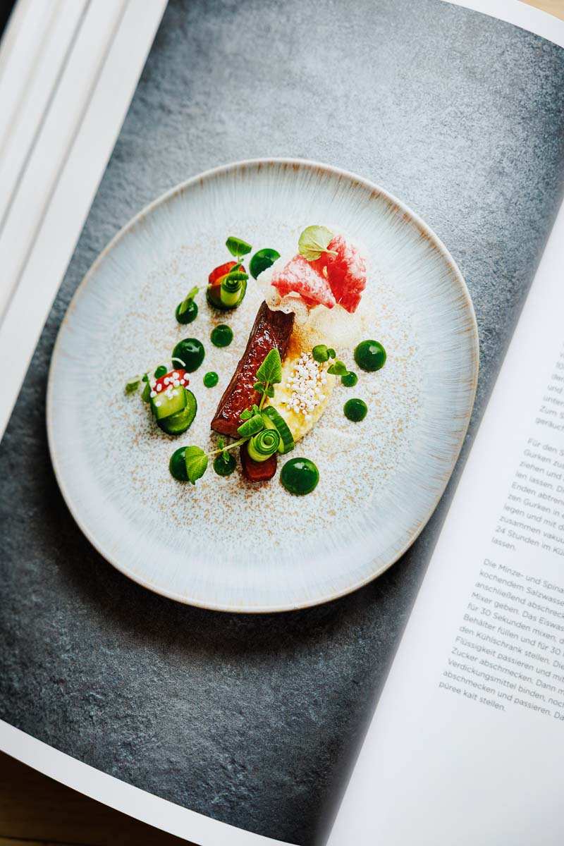 Auch fotografisch fügt sich Schneiders Tellerbild nahtlos in die gestalterische Linie des Bandes ein. Die Inszenierung bleibt ruhig, der Fokus liegt ganz auf dem Produkt. Helge und Patrick Kirchberger setzen wie gewohnt auf gedämpftes Licht, neutrale Hintergründe und eine präzise Bildsprache – nichts stört das visuelle Narrativ, das stark über Atmosphäre funktioniert.