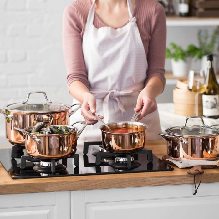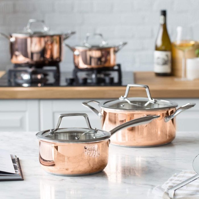 Wenn es um schöne Töpfe geht, gibt es bei mir eigentlich nur ein Konzept. Kupfertöpfe. Oder sagen wir wenigstens kupferbeschichtete Töpfe. Denn wenn du bereits mit Kupfer gekocht hast, wirst du genau wissen, wie es ist, mit solch einem Set zu kochen. Man beamt sich seine Küche quasi nach Frankreich und kocht in einem romantischen Ambiente. Da ich kein großer Fan von verschieden zusammengekauften Töpfen bin, sind Sets bei mir immer die erste Wahl. Dieses Set mit Kupferbeschichtung von Springlane kommt mit drei Töpfen und einer Kasserolle und dürfte die meisten Aufgaben ausreichend abdecken.