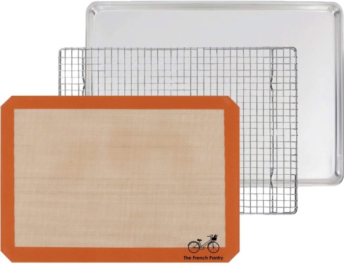 Dieses 3- teilige Backset darf nicht unterschätzt werden. Es ist sicherlich auch zum Backen geeignet, jedoch ist diese Silikonmatte samt Edelstahlrost und Aluminiumbackblech zu viel mehr geeignet. Du kannst auf dieser sehr universell nutzbaren Matte auch herzhafte Dinge zubereiten oder vorbereiten. Das lebensmittelechte Silikon sorgt dafür, dass garantiert nichts anhaftet oder kleben bleibt. Du wirst sehen, dass du bei guter Pflege über Jahre hinweg perfekte Ergebnisse auf dieser Matte erzielen kannst. Das Alubackblech hat eine gute Stärke und das Trio ist sehr gut verarbeitet. Da kann man mit dem Erwerb nicht viel falsch machen.