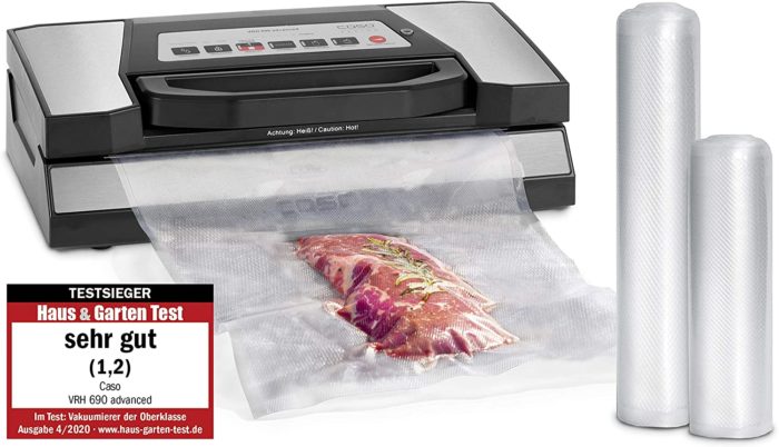 Natürlich braucht man für das Garen im Beutel auch einen Vakuumierer, welcher über einstellbare Schweißzeiten und Vakuumstärken verfügt. Einer der besten Vakuumierer für den Heimbedarf ist der CASO VRH 690. Er verfügt über eben genau die Einstellfunktionen und ermöglicht zudem das Vakuumieren von trockenen, feuchten, weichen und harten Lebensmitteln. Großartig ist die Funktion der doppelten Schweißnaht. Denn sollte eine nicht intakt sein, ist es ganz sicher die Zweite. Es kann ein maximaler Unterdruck von -0,9 bar erzeugt werden, das ist mehr als genug. Im Lieferumfang sind zudem 2 Folienrollen und ein Vakuumierschlauch für Behälter enthalten.