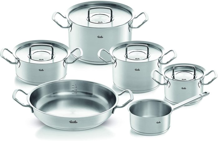 Denn kaufst du dir ein einheitliches Set, ist es erstens im Schrank besser sortierbar und zweitens kannst du damit auch viel besser arbeiten als mit den schon teilweise oxidierenden Töpfen, die du schon seit dem letzten Einzug nicht mehr einsetzen wolltest. Es muss nicht immer Kupfer sein. Das 5- oder 6-teilige Set von Fissler kann ich allen Fans von langlebigem Material nur ans Herz legen. Die Größen sind gut durchdacht und werden ihren Einsatz bei dir finden. Die Qualität ist sehr gut und die Haptik ist großartig, da die Griffe gut in der Hand liegen. Versprochen.
